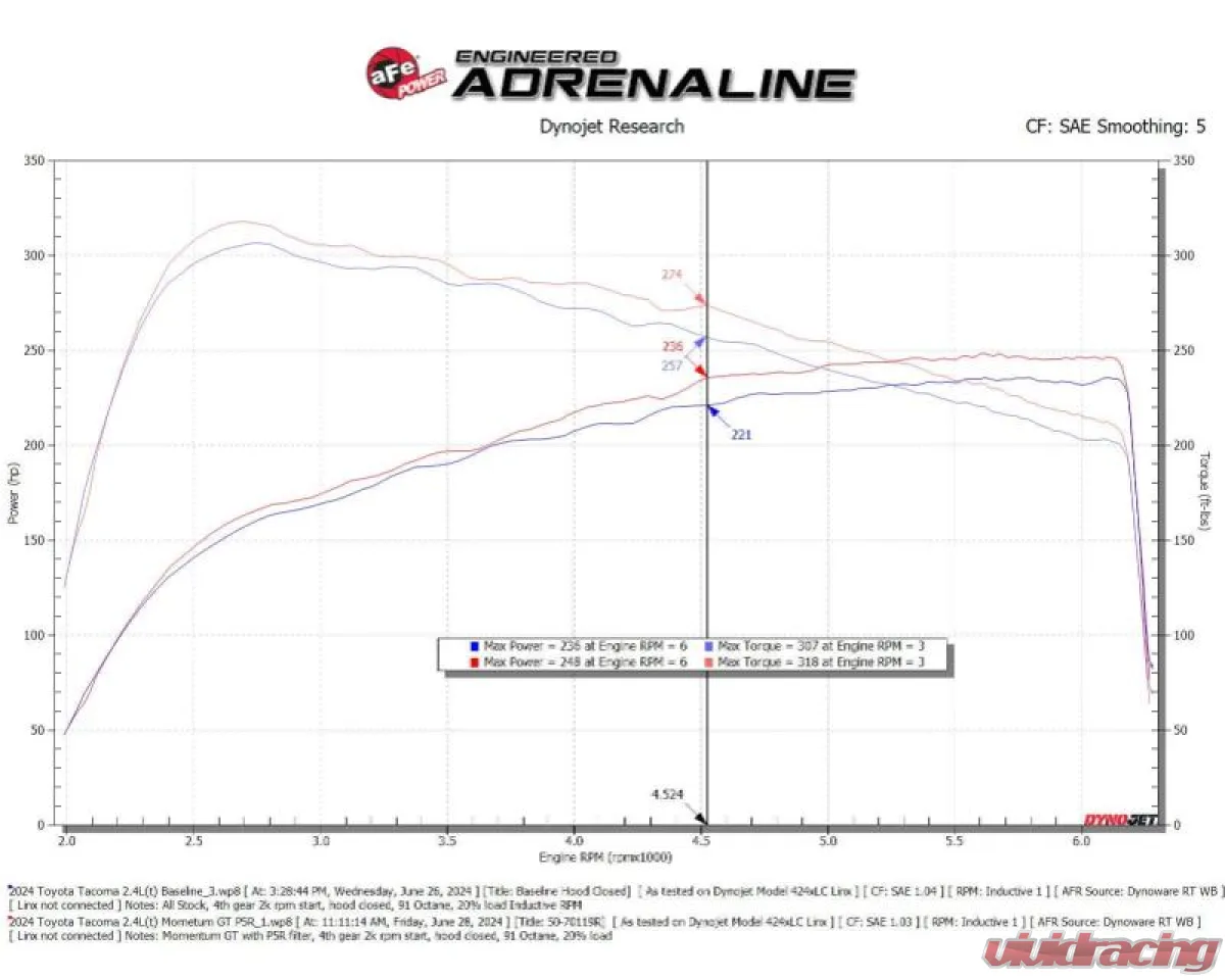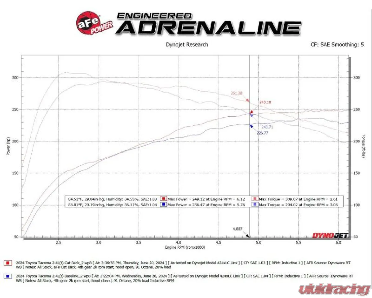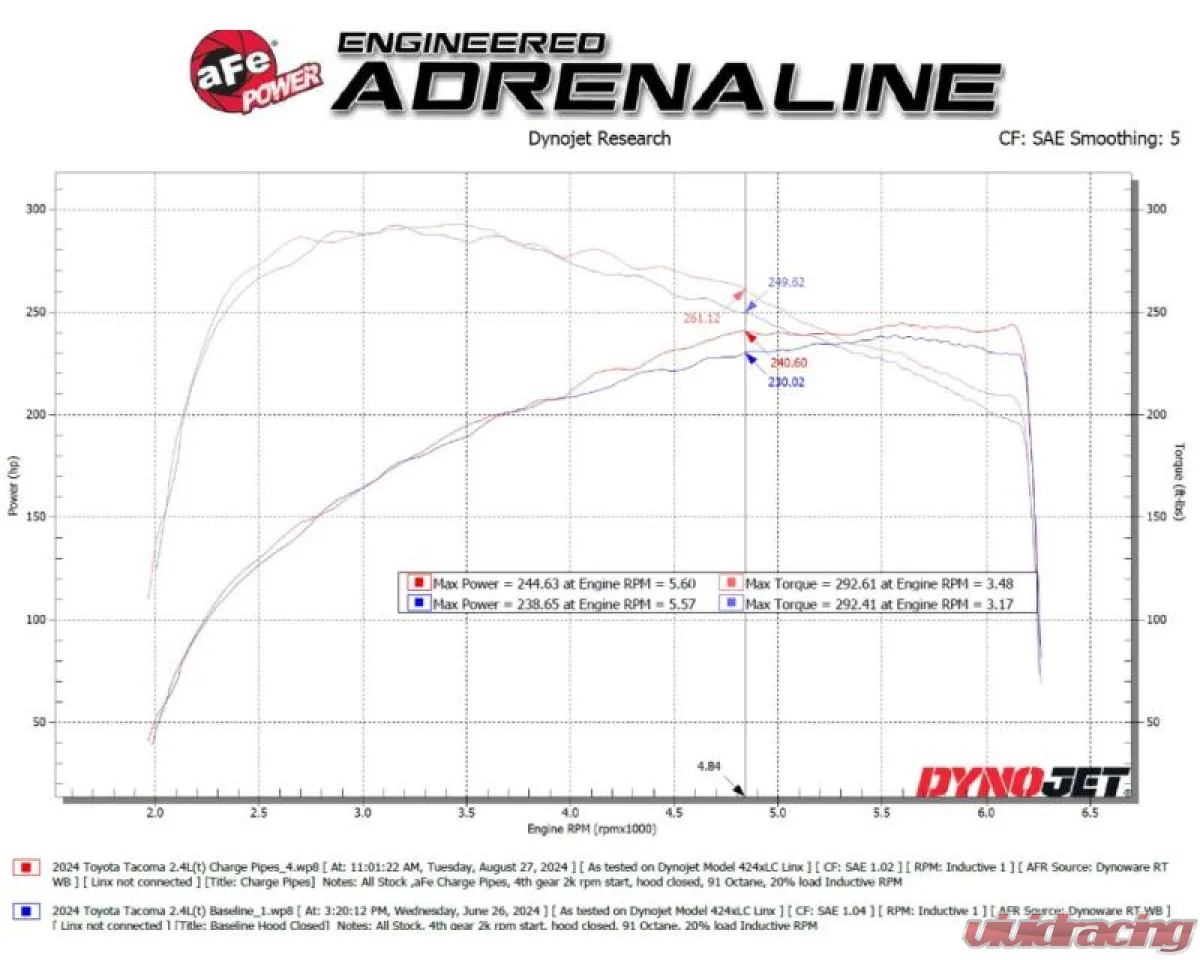 Now that your turbocharged Toyota Tacoma is breathing better, it’s time to improve the exhaust flow. Exhausts are always the biggest restriction on a turbocharged vehicle. Turbos need to just blow straight out the hot side. But if you did this, it would be extremely loud like a trophy truck! So aFe has developed their new catback exhausts in different tip variations for the off-road enthusiast. A catback will not only add more horsepower and torque, it will help improve the sound of the truck giving you way more enjoyment as you go through the RPMs. The catback exhaust tested added nearly 13 horsepower and 15 ft/lbs of torque as tested on a Dynojet dyno.