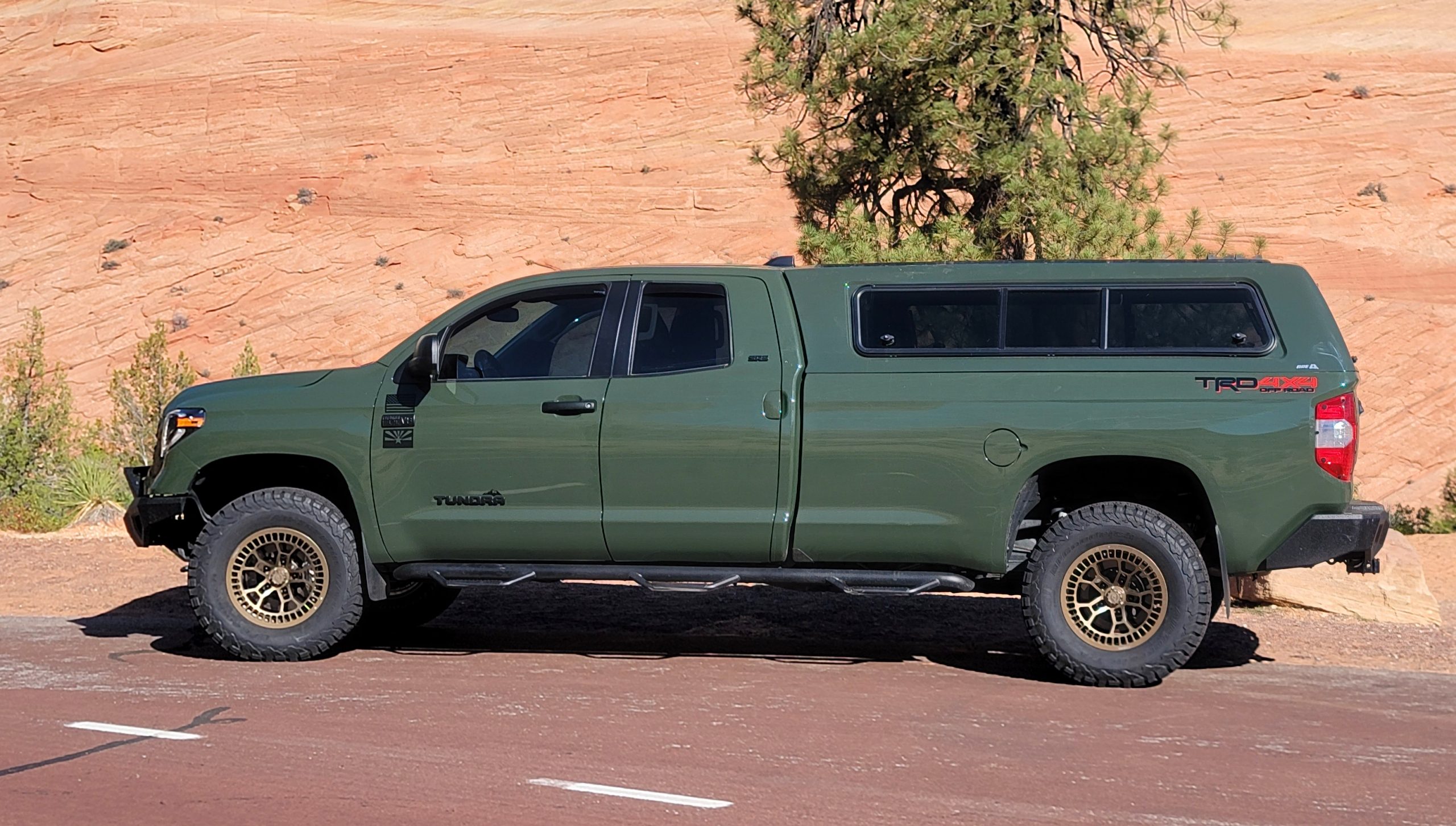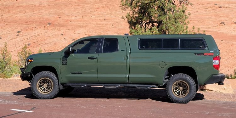 The striking Army Green Toyota Tundra featured below is sporting a set of D02 forged wheels in the Satin Bronze finish. The bronze wheels together with the rugged green exterior paint color match flawlessly to deliver a bold off-road aesthetic. This Tundra is fitted with 18×9 D02 wheels all around with a +12 offset, 110 center bore, and 5×150 bolt pattern. Each wheel weighs in at 11.74 kilograms (25.88 pounds) and has a load rating of up to 1100 kilograms (2425 pounds). The recommended tire fitment for this setup is 295/70/18 or 285/70/18.
