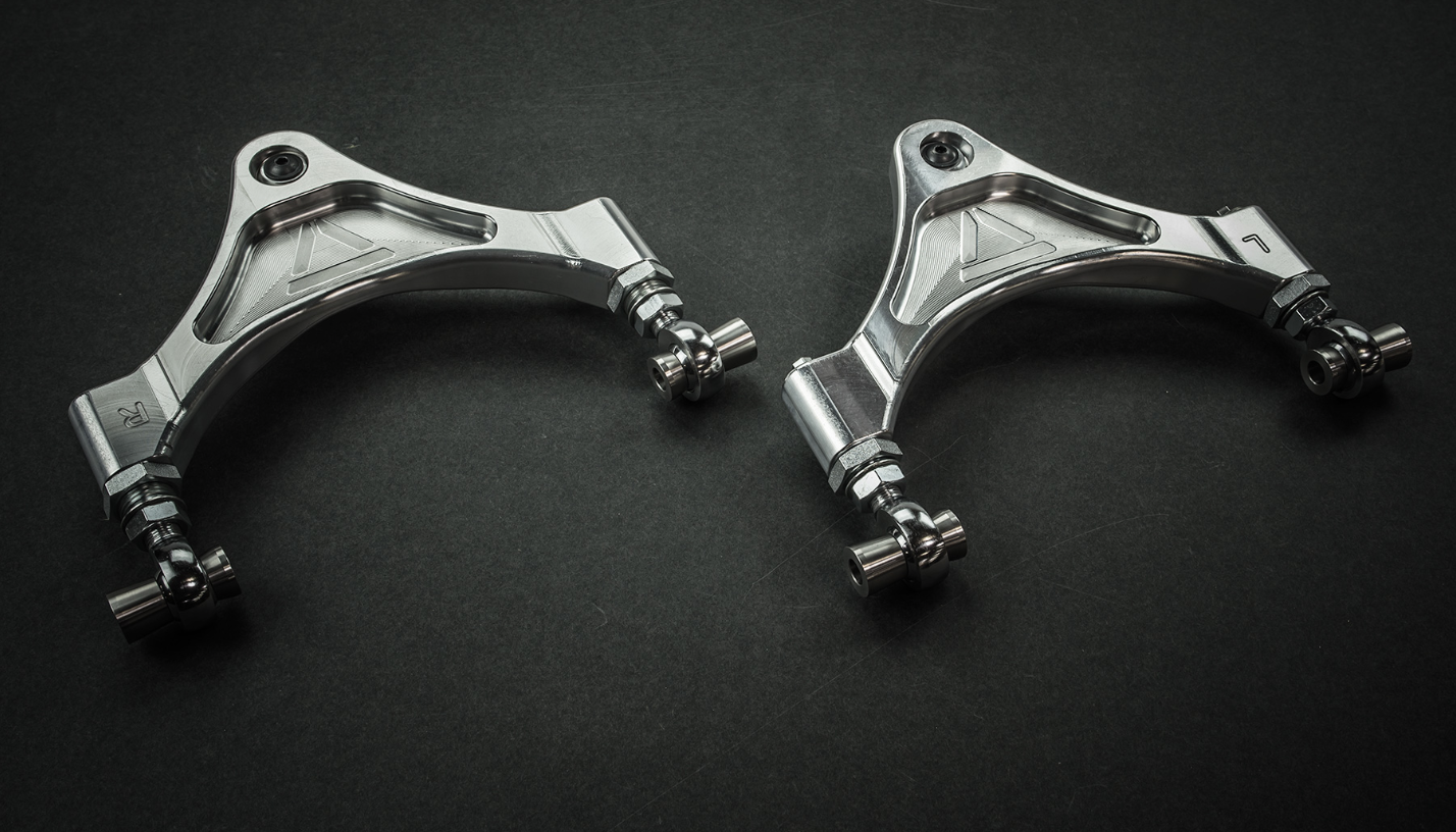Voodoo13’s front upper control arms fitted for the 2009-2016 Nissan GTR R35 are made from CNC milled aerospace grade 6061 aluminum, featuring both dual adjustment functionality and an innovative design. The slim upper spindle mount helps prevent upper control arm slap from excessively lowered cars, while utilizing an encased spherical bearing design that works to prevent deformation from impact or high driving forces over time. The easy-to-reach dual adjusters allow for caster and camber correction, all while never being unbolted from the car, to suite any application. You can check out all of our Voodoo13 suspension products here.