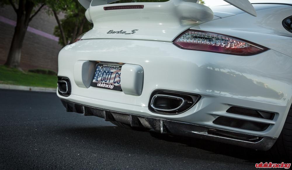 We thought we would turn up the heat on our Project Porsche 997.2 Turbo and have it draw some attention with an updated look. Even though the white body with black wheels and carbon fiber accents looked classy, we needed that extra bling edge that our old Project 997.1 Turbo had with its chrome red lip HRE Wheels. So we took a set of our new Agency Power Split 5 Wheels (which are instock for immediate shipping) and custom painted them gloss black with a chrome blue face. Bammmoooo! Its loud for sure! The 19×8.5 and 19×11 centerlock (also available in 5×130) wheels are a 1 piece forged monoblock. Wrapping the wheels is a brand new set of Toyo Tires Proxes in a 235/35/19 and 305/30/19. To match our Agency Power carbon fiber accessories (front lip, side vents, mirrors) and NR Auto GT2 rear wing, we installed the coming soon first article Agency Power finned carbon fiber diffuser.