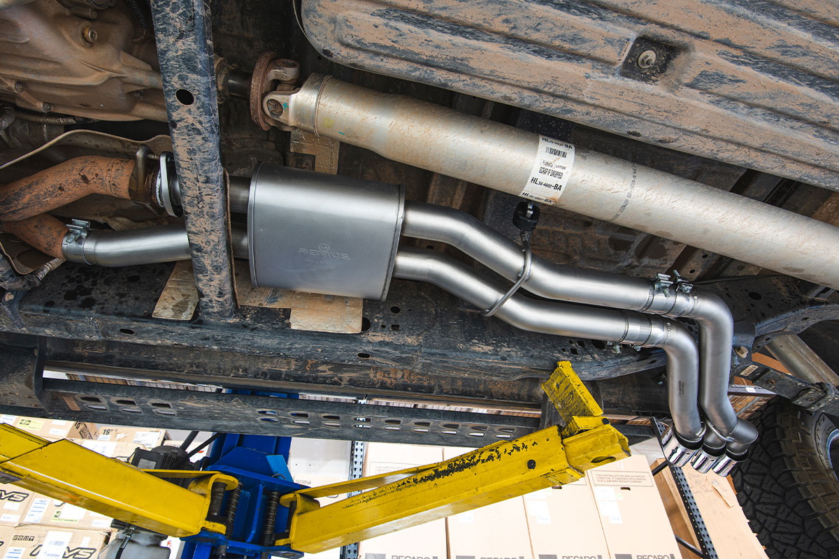The exhaust is designed to replace everything from the catalytic converter back. Where the OEM exhaust uses two large mufflers, the Remus exhaust uses a single small muffler, giving the EcoBoost Raptor an aggressive exhaust note. Once we got the Raptor up on the lift, we uninstalled the factory exhaust and installed the Remus exhaust. Compared to the OEM exhaust, the Remus exhaust is significantly lighter and much higher quality.