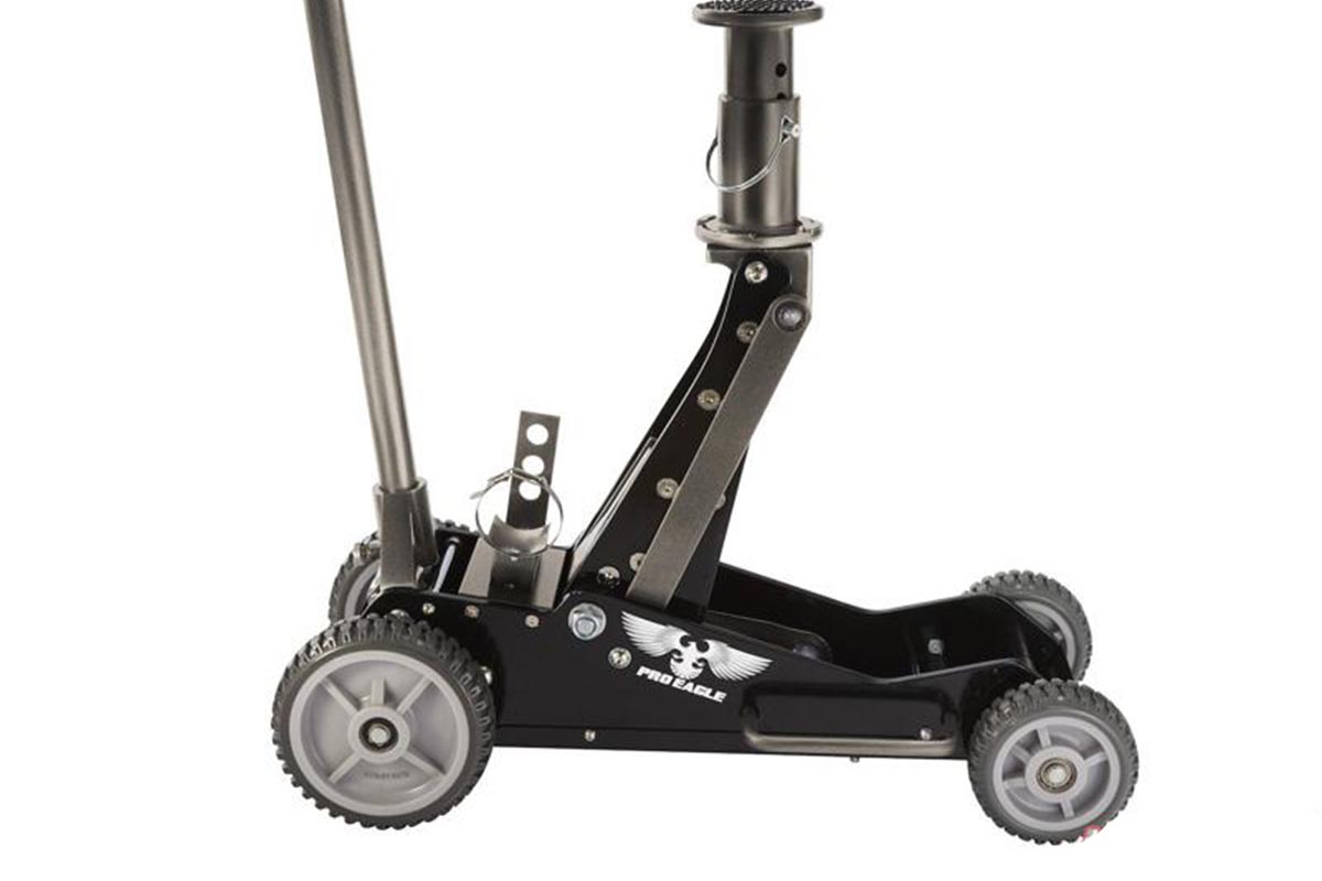 Similar to a standard floor jack, an off-road jack features the same hydraulic pressure and leverage method to lift the vehicle. The difference between a standard floor jack and an off-road jack is the portability and utility. With larger wheels that feature tread, an off-road jack can be used on all sorts of different terrains. An additional benefit to an off-road jack is the weight compared to a household floor jack.