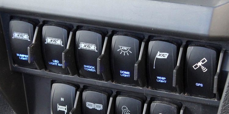 The four high powered circuits have relays inline with diode protection to prevent voltage spikes due to field collapse. With this feature, all the vital components are protected within the system, thus keeping your equipment safe. Each switch connector is wired for bottom row LED lighting to illuminate each function of individual toggles.