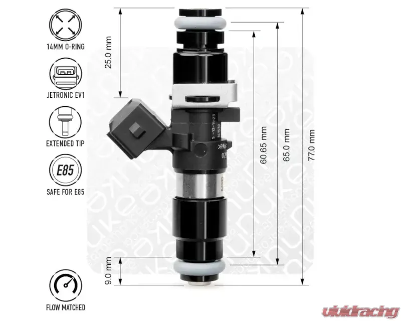 - Configured as a Bosch EV14L injector, measuring 65mm between O-rings.