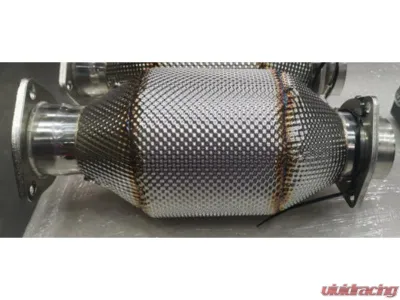 The Capristo Exhaust 250 Cell Secondary Cat with Metal Heat Shields (part number 02FE0580300X) is designed specifically for select Ferrari models, ensuring a precise fit and optimal performance. This exhaust component enhances exhaust flow while maintaining the integrity of the vehicle's emissions system, making it ideal for track enthusiasts looking to maximize their vehicle's capabilities.