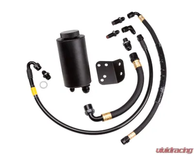Our over-engineered Triple-Baffled Power Steering Reservoir (aeration & spillover proof) is at core of this kit. It optionally comes w/ upgraded Setrab Oil Cooler that can mount under driver side headlight (or in center) for additional airflow. Our reservoir is constructed of 6061 aluminum & is anodized black w/ laser etched cap. Reservoir itself uses our aluminum bracket & can be mounted in stock location.