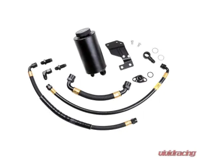 Our over-engineered Triple-Baffled Power Steering Reservoir (aeration & spillover proof) is at core of this kit. It optionally comes w/ upgraded Setrab Oil Cooler that can mount under driver side headlight (or in center) for additional airflow. Our reservoir is constructed of 6061 aluminum & is anodized black w/ laser etched cap. Reservoir itself uses our aluminum bracket & can be mounted in stock location.