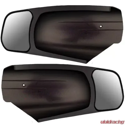CIPA's Custom Towing Mirrors were designed to fit over standard factory rearview side mirrors, and are available in over 40 exclusive applications to fit a variety of popular truck and SUV models. The CIPA Custom Towing Mirror is durable, aerodynamic, and sleeve fitted to your vehicles specifications. These mirrors will slide snugly over your vehicles existing rearview side mirror, and features an additional adjustable mirror on the outboard end that extends your towing vision, without obstructing your existing vehicle mirror. No tools are required, and no marks or holes are left on your vehicle. The CIPA Towing Mirrors and installation knobs are made with durable ABS plastic known for its strength, rigidity, and unbreakable security. The mirror face is made with scratch-resistant glass for years of unobstructed towing use. The installation wedges are formed from a polypropylene plastic that has excellent long-term shape conformity, and provides years of installation reliability. CIPA Custom Towing Mirrors can withstand the elements to provide increased all-weather Towing Vision capability. This kit includes 1 driver side mirror, 1 passenger side mirror, 2 installation knobs, 1 left hand installation wedge, 1 right hand installation wedge, 4 felt strips, and illustrated installation instructions. Note: These mirrors will NOT fit over extendable mirrors. Expand your Horizons