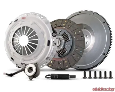 Heavy duty pressure plate. Sprung hub steel-backed organic lined disc. Steel flywheel included. Hydraulic slave cylinder included. Clutch/flywheel package deal.