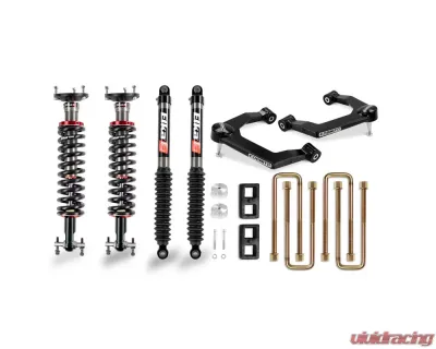 There is no guesswork. Cognito components are engineered, manufactured and assembled in the USA. The Cognito 3 Inch Performance Ball Joint Leveling Lift Kit includes the Cognito Ball Joint SM Series Upper Control Arm Kit, Elka Performance Series Coilover front shocks, Elka Performance Series rear shocks and 2 Inch Block and U Bolt kit- all with hardware included.