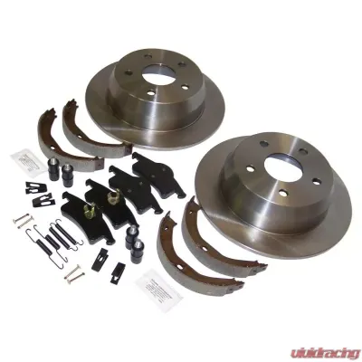 Application (Fitment): 1999-2004 WJ Grand Cherokee;Notes: Rear Disc Brake Service Kit:: Includes 2 Rotors, 1 Pad Set, 1 Parking Brake Shoe Set, and All Necessary Hardware;Included in Package;Axle: Any;Transfer Case: Any;Transmission: Any;Engine: Any