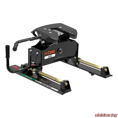 The CURT A16 is designed to provide a surprisingly quiet ride while maintain superior towing power. It has a gross trailer weight capacity of 16,000 lbs. and can handle a vertical load up to 4,000 lbs. It comes with a three-position coupling indicator visible from your pickup truck cab, an extra wide head for easier coupling and high-strength interlocking die-cast jaws for a secure hold on your 5th wheel trailer. This 16K 5th wheel hitch excels in quiet 5th wheel towing. It uses a fully articulating torsion head, a cast yoke with poly-torsion inserts and interlocking jaws to create stability for your trailer and tow vehicle. These components also allow the A16 to suppress shock and vibrations and reduce any additional noise coming from your trailer. Like the other CURT A-Series hitches, the A16 is coated with a durable carbide powder coat finish. It is tested in accordance with SAE J2638 for safety and includes a limited lifetime warranty. This A16 5th wheel hitch head comes attached to the CURT R16 roller. Our 5th wheel rollers mount easily onto a set of 5th wheel rails or a gooseneck adapter already installed in the bed of your pickup truck. CURT 5th wheel rollers feature solid construction and offer a sturdy mounting place for your 5th wheel hitch, ensuring that none of its towing strength is lost. CURT 5th wheel rollers are also true rolling units, meaning they actually roll on wheels that bear the weight of the trailer rather than simply sliding on hollow rods as seen in competitive models. With a thick operating handle, the roller smoothly rolls the 5th wheel head forward and back, locking securely into each position as desired. CURT rollers also provide up to 12" of displacement as well, unlike the more common 10", to give you a wide range of motion and plenty of space to get your RV or other 5th wheel trailer around any turn.