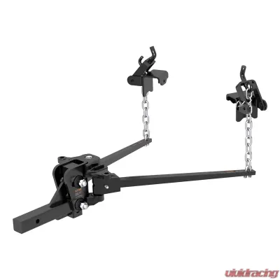 The CURT weight distribution hitch is a specialized towing system that provides improved vehicle and trailer control by leveling the trailer and more evenly distributing its tongue weight across the trailer's and vehicle's axles. Weight distribution hitches are commonly used on travel trailers and campers but can also be applied to other large loads. CURT WD hitches come with a 2" x 2" shank and are compatible with class 3, 4 and most 5 trailer hitches, including Xtra Duty and Commercial Duty (2-1/2" replacement WD shank may be required), as well as some RV trailer hitches. While a weight distribution hitch will increase the gross trailer weight capacity of most trailer hitches, the vehicle's weight carrying capacity must be taken into consideration before towing a heavier trailer (NOTE: Never exceed the lowest weight capacity of any towing component).This trunnion bar weight distribution hitch features a heavy-duty formed head and square spring bars constructed from forged steel. It offers a gross trailer weight capacity up to 10,000 lbs. and a tongue weight capacity of 1,000 lbs. It also includes hook-up brackets, spring bar safety chains and a pin and clip. To protect this hitch from scratching, chipping, rust and UV damage, it also comes with a durable black powder coat finish. A trailer ball must be purchased separately.