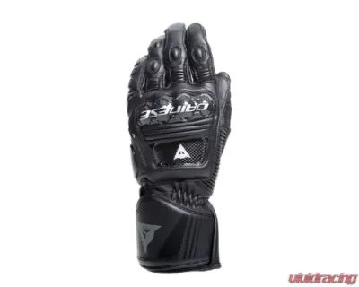 The Dainese Druid 4 leather racing gloves are an expression of the highest protection standards, designed for maximum performance on the track and the road. World Championship safety and ergonomics are guaranteed by the presence of the pre-curved and thermoformed sleeve, the carbon inserts on the knuckles and back, and the thermoplastic protector on the little finger. They are guaranteed to be resistant owing to the polyurethane inserts on the palm and joints, while four-way stretch ensures extreme comfort and a perfect fit at all times.