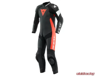 Dainese Tosa one-piece motorcycle suit with CE EN 17092 certification made of premium perforated Tutu cowhide for optimized temperature on hot days. The classic Dainese fit is slim and fitted, while at the same time providing great freedom of movement due to the S1 elastic fabric inserts on the inner arm, groin, and back leg areas. The biaxial stretch fabric inserts on the back, as well as the stretch patches on the knees and shoulder blades, are designed to simultaneously guarantee that all skin is protected, in addition to maximum flexibility and freedom of movement. The special protection system combines Dainese's classic internal protectors with removable sliders on the knees and interchangeable aluminum plates on the shoulders: A distinctive Dainese technology designed to support and facilitate sliding in case of a fall, thus preventing the dangerous risks of rolling caused by grip on asphalt. The aerodynamic hump is designed to accommodate the water bag, which can be connected to the helmet. It is placed at the shoulders and neck to protect the upper back, performing a function complementary to the back protector.