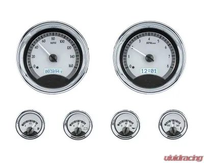 The MHX-1024 features a larger speedometer measuring 5.4" overall (5" cutout) complemented by four smaller gauges at 2.3" (2.05" cutout). Each gauge is housed in a sleek, chromed billet aluminum casing that adds a touch of modern flair to any classic interior.