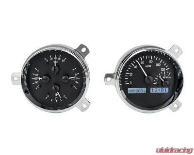 If you've been searching for a seamless upgrade for your 1951-52 Chevy car, something beyond almost-there, flat-faced round gauges, the wait is over! With perfectly contoured, machined aluminum housings dripping with chrome and state-of-the-art electronics stuffed inside, your un-modified dash never looked so good! Get yours with blue, red or white LED backlighting and Black or Silver Alloy face styling. Supplied sensors for oil pressure, water temperature and speed allow your choice of drivetrain, from mild to wild, traditional to modern!