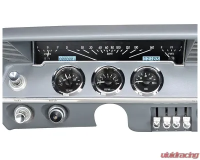 The new MHX Systems fit directly into the stock dash of a 1961-62 Chevy Impala without modification. The upper (speedometer/voltmeter/fuel level/message centers) display utilizes the stock trim ring, whereas the lower displays (tachometer/oil pressure/water temp) include machined aluminum/chromed new instrument housings.