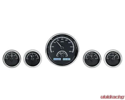 With its distinctive gauge design, the MHX-1015-K-W features a larger speedometer measuring 6-1/4" overall (5-7/8" cutout) and four smaller gauges at 3" (2-3/4" cutout). The gleaming chromed billet aluminum housings and bezels not only enhance the aesthetic but also ensure durability. This setup not only looks great but is engineered for precision and clarity, making it a must-have for any serious car enthusiast.