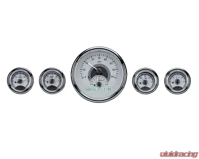 Made popular by the '59 Chevy Impala, this contemporary five gauge layout lends itself to an enormous amount of flexbility. With the larger instrument measuring 6-1/4" overall (5-7/8" Cutout) and the four smaller gauges at 3" (2-3/4" Cutout), this is one distinctive choice. Chromed billet aluminum housings and bezels round out the package.