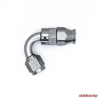 Introducing the 6 AN Female Flare Swivel Hose End, complete with Ferule and Olive! This 120-degree hose end is crafted from high-quality PTFE and features a stunning anodized DW Titanium finish.