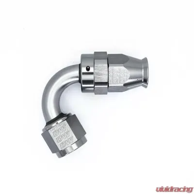 Introducing the 8 AN Female Flare Swivel Hose End, featuring a 120-degree angle and crafted from durable T6061 aluminum with a striking anodized DW Titanium finish. This hose end comes complete with a ferule and olive, making it a perfect addition to your setup.