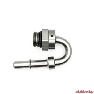 Introducing the 8AN ORB Male to 3/8 Inch Male EFI Quick Connect Adapter, featuring a sleek 180-degree design and an included O-Ring, all wrapped in a stunning anodized DW Titanium finish.