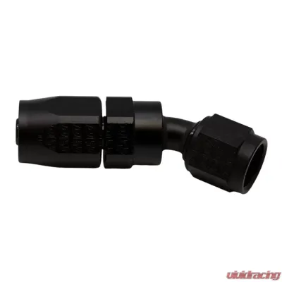 Introducing the 6 AN Female Flare Swivel 30-Degree Hose End, crafted from high-quality T6061 aluminum and finished in a sleek anodized matte black. This fitting is designed to combine functionality with style, making it a great addition to your setup.