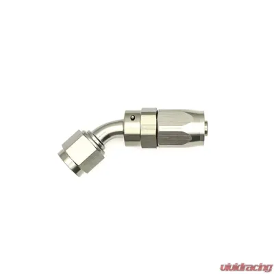 Introducing the 6AN Female Swivel 45-Degree Hose End in a sleek DW Titanium finish. This fitting is designed to add a touch of style and functionality to your setup.