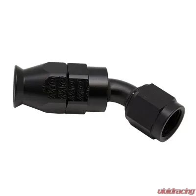 Introducing the 6AN Female Swivel 45-Degree Hose End PTFE, complete with one olive insert, all wrapped up in a sleek anodized matte black finish.