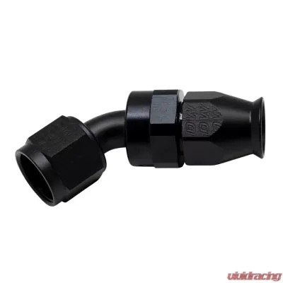 Introducing the 8AN Female Swivel 45-Degree Hose End PTFE, complete with one olive insert and finished in a stylish anodized matte black. This fitting is designed to bring both functionality and flair to your setup!