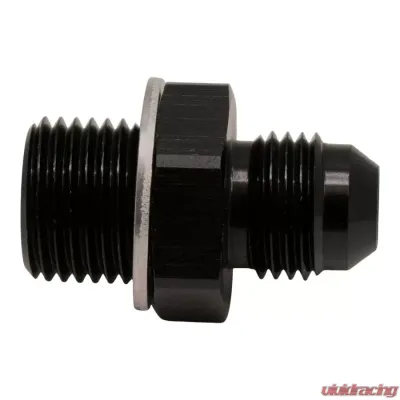 Introducing the 6AN Male Flare to M16 X 1.5 Male Metric Adapter, complete with a crush washer and finished in a sleek anodized matte black. This piece is designed to seamlessly connect your components with style and reliability.