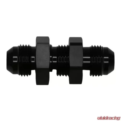 Introducing the 8AN Male Flare to 8AN Male Flare Bulkhead Adapter, complete with a nut and finished in a sleek anodized matte black. This adapter is designed with both style and functionality in mind!