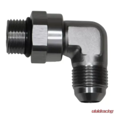 Introducing the 8AN ORB Male Swivel to 8AN Male Flare 90-Degree Fitting, beautifully crafted in Anodized DW Titanium. This fitting is designed to bring both style and functionality to your setup.