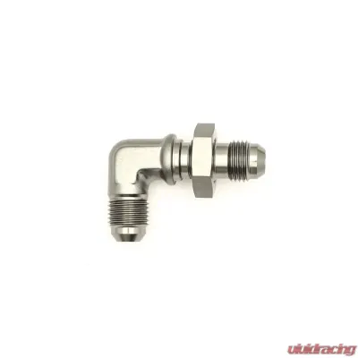Introducing the 6AN Male Flare to 6AN Male Flare Bulkhead Adapter, featuring a convenient 90-degree angle and a stylish anodized DW Titanium finish. This adapter comes complete with a nut, making it a fantastic addition to your setup!