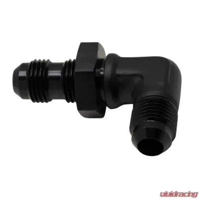 Introducing our 6AN Male Flare to 6AN Male Flare Bulkhead Adapter at a convenient 90-degree angle, complete with a nut. Finished in a sleek anodized matte black, this adapter is designed to meet your needs with style and functionality.