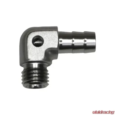 Introducing the Metric M12 to 3/8 Inch Hose Barb 90-Degree Fitting with a 1/8 Inch Venturi Port, beautifully finished in Anodized DW Titanium. This fitting combines functionality with a sleek design, making it a perfect addition to your setup!