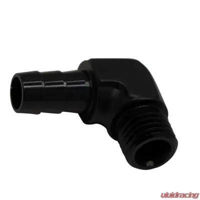 Introducing the Metric M12 to 3/8 Inch Hose Barb 90-Degree Fitting with a 1/8 Inch Venturi Port, finished in a sleek Anodized Matte Black. This fitting is designed to seamlessly integrate into your setup while adding a touch of style.