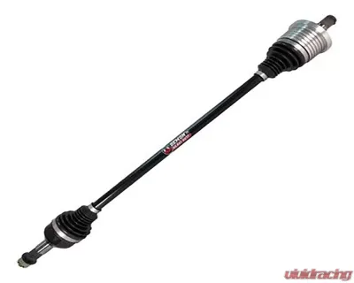 This axle features a robust construction utilizing larger CV joints and shafts, providing a significant increase in diameter—15% to 20% over standard axles. The inner cage is crafted from 4340 chromoly steel, known for its high tensile strength and durability. The dual heat treatment process enhances the overall resilience of the axle, making it suitable for demanding environments.