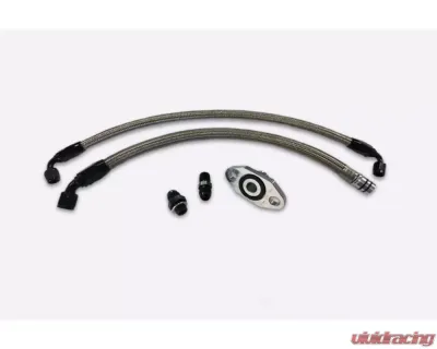 This oil line kit is designed to install an S300 or S400 turbo on your common rail 5.9 OR 6.7 Cummins in the 2nd Gen location. With all braided stainless lines and billet CNC machined adapters this kit will not only function perfectly it will look great doing it! Includes -10 oil drain and -6 oil supply. The oil drain utilizes an O-ring seal at the turbo drain adapter and a double O-ring seal at the engine block. Don?t settle for cheap rubber lines with hose clamps when you can have a high-quality oil line kit like this!