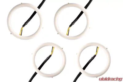 All input wires activate the halos, at different brightness levels. All amber-colored halos ship with low priority drivers. This means that if both low and high power inputs are powered, the LED will light up with low power level. This is convenient for connecting the red wire to a parking light or DRL signal, for use during the day as a high-power DRL. Then, if the white wire is connected to the headlamp power, they will dim down at night. If the yellow wire is powered at any time, the halo will light up at 200 percent brightness momentarily, intended for signalling (dims automatically if powered for more than two seconds).