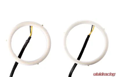 All input wires activate the halos, at different brightness levels. All amber-colored halos ship with low priority drivers. This means that if both low and high power inputs are powered, the LED will light up with low power level. This is convenient for connecting the red wire to a parking light or DRL signal, for use during the day as a high-power DRL. Then, if the white wire is connected to the headlamp power, they will dim down at night. If the yellow wire is powered at any time, the halo will light up at 200 percent brightness momentarily, intended for signalling (dims automatically if powered for more than two seconds).