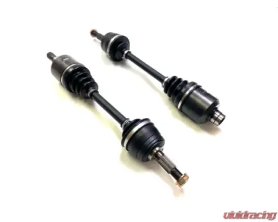 These axles feature a proprietary 2-piece Chromoly outer CV housing, ensuring exceptional strength and durability. The 300M splined wheel stub enhances the connection to the wheel hub, while the axle bars and differential spline plug are designed for seamless integration with OEM Honda/Acura 26-spline or 28-spline wheel hubs, compatible with various aftermarket options.
