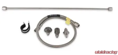 This plumbing kit includes the components needed to install an exhaust back pressure sensor (the sensor is available separately - part number 554-102). This type of sensor is often used with data acquisition, or EFI systems to monitor the exhaust back pressure just prior to the turbo. The exhaust heat and eflow making tough on the sensor, so it is mounted remotely and isolated by the stainless hardline & flexible Speed-Flex Hoset includes: weld bung, pre-made stainless hardline, Speed-Flex Hoseounting clamp, adapters & hardware.