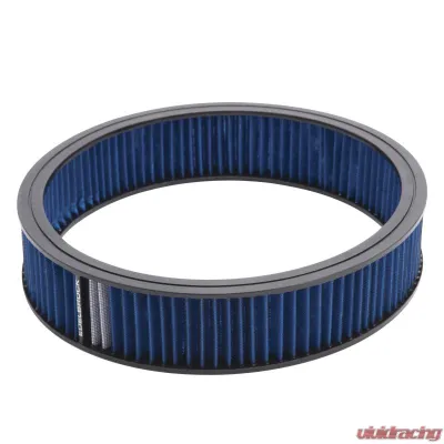 The PRO-FLO high-flow 14" round air cleaner, model #43667, comes with a stylish, color-matched breathable lid and a robust 3" tall filter element. It's designed to fit seamlessly with all popular 5-1/8" diameter carburetors, making it a versatile choice for your vehicle.