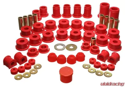 The system includes front and rear control arm bushings, front and rear sway bar bushings, track arm bushings, and tie rod end boots.