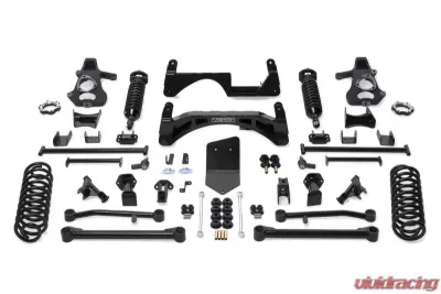 Integrated Lower Control Arm Crossmembers. • Offset Ductile Iron Front Steering knuckles retain stock like turning radius with minimal increase of track width. • No disassembly of factory strut assembly required for installation. • Rack and Pinion is retained in stock position. • Full lift height for proper clearance of 35/1250R17 tires. • Rear system includes upper and lower tubular link arms and trac bar relocation bracket.
