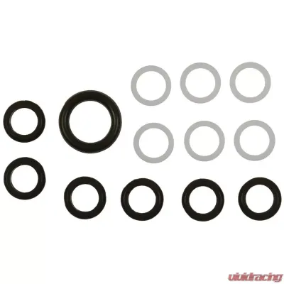 Designed to be compressed between two or more surfaces to prevent fluid leak during extreme vehicle operation. High temp Viton?? material ensures proper sealing during extreme heat conditions. Contains multiple O-rings in various sizes for ease of installation. Undergoes texting to maximize longevity during extreme vehicle operation.