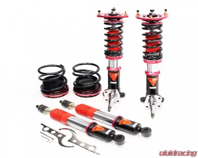 Introducing the Mono-MAX coilover system by Godspeed Project. The Mono-MAX series is the top tier line offered by Godspeed Project offering a streetable track built coilover at an affordable price. It features a Mono-Tube shock that is made out of a carbon seamless steel 52mm tube with a 44mm internal piston providing maximum dampening response. The cold-bent springs are made from high strength SAE9252 steel to optimize the balance between performance and comfort. Using a high quality shock oil made in Italy, we can guarantee efficient shock absorbing action at any ambient temperature on and off the track. The top of the shock is attached to the car using a high quality top hat that features a high performance bearing pillow ball mount (when applicable). For the bottom of the car, the shock brackets are made out of a T7075 forged aluminum for lighter weight without sacrificing durability which also includes brake line brackets (when applicable). The Mono-MAX offers 40 level of dampening adjustability which can be set to your liking.