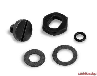 Introducing the Holley Adjustable Needle and Seat Hardware Kit in a sleek black finish. This kit includes everything you need to replace the needle and seat lock screw and adjustment nut for your carburetor. Designed to be compatible with all Holley carburetors that feature an adjustable needle and seat, this kit ensures you have the right components for a smooth operation.